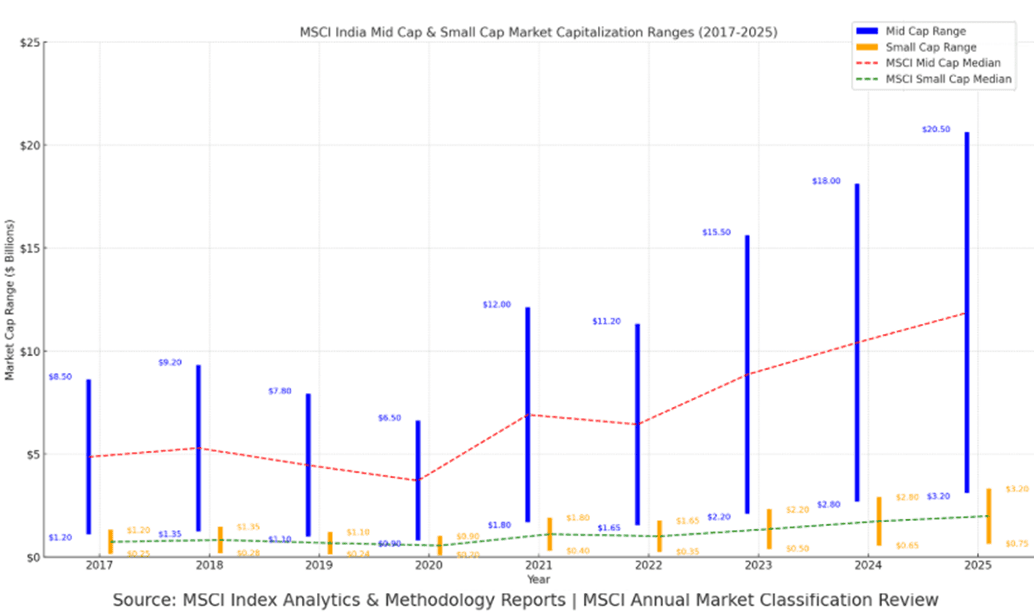 Simultaneously, market segment definitions have evolved substantially—mid-cap upper limits have grown from $6 billion (2017) to a projected $30 billion (2025), with small-cap limits rising from $1.8 billion to $8.4 billion over the same period, increasingly aligning with global benchmarks.